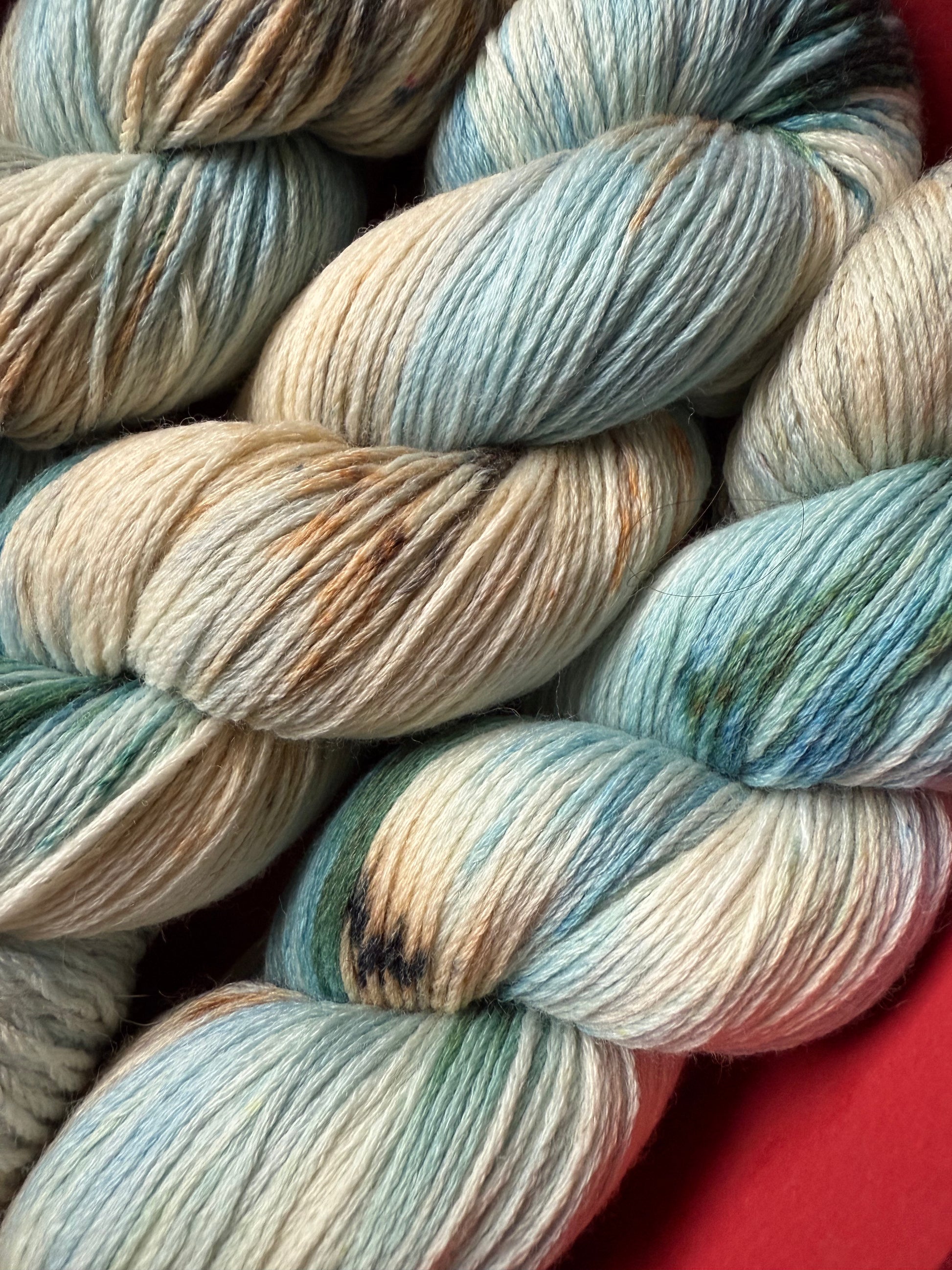 Soft blue-greens flow into sandy beige, misty cream, and quiet speckles of driftwood brown. Each skein feels like a breath of coastal air — pure, soothing, and endlessly peaceful.